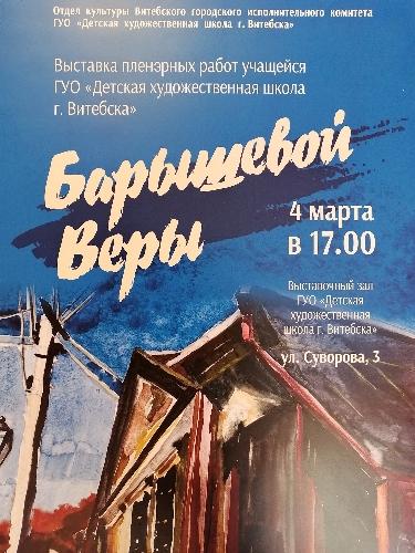 4 марта в преддверии Международного женского дня в фойе ГУО "Детская художественная школа г.Витебска" состоялось открытие персональной выставки учащейся 5 класса школы Барышевой Веры. На выставке представлены пленэрные работы, выполненные в различных техниках.